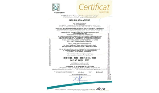 A l’heure du débat national sur la transition énergétique et de la transposition française de la nouvelle directive « Efficacité Energétique » de l’Union Européenne, la certification ISO 50001 délivrée par l’Afnor, matérialise, pour ses clients, les engagements pris par Dalkia en matière d’économie d’énergies.