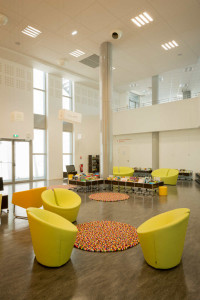 L’escalier monumental est agrémenté, quant à lui, de luminaires Tinos suspendus dotés de tubes fluorescents T5 80 W, avec une température de couleur de 4 000 K que l’on retrouve dans l’ensemble du bâtiment, pour aider à la concentration de ses visiteurs et au confort visuel de ses employés.