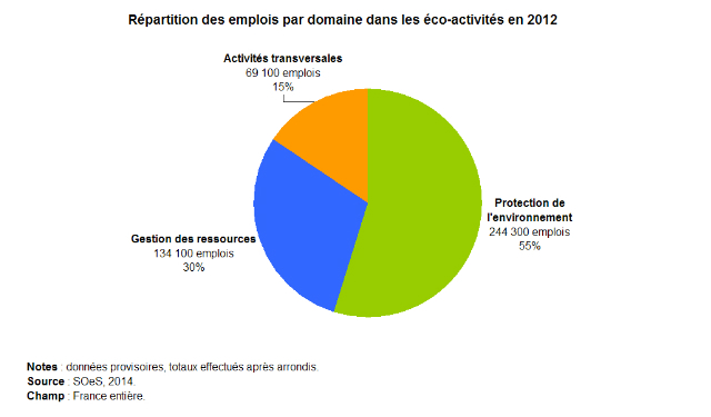 Aujourd’hui, en termes d’effectifs les domaines les plus importants sont ceux des déchets, des eaux usées et des énergies renouvelables. Les éco activités emploient 442 400 personnes en 2013. Entre 2012 et 2013, les effectifs ont diminués de -0,3% contre -0,2% dans le reste de l’économie. Cela s’explique par la baisse de l’emploi dans les énergies renouvelables, la croissance des effectifs dans la réhabilitation des sols et eaux a atténué la baisse globale. En effet, c’est le domaine sur le quel on constant la plus forte croissance en 2013 et est le plus performant en termes de croissance des effectifs sur ces neufs dernières années. « Les activités de protection de l’environnement comptent plus de la moitié des emplois environnementaux (244 300). La gestion des ressources naturelles (134 100) et les activités transversales (69 100) se partagent la moitié des emplois restants.
