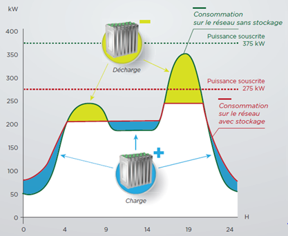 La durée de vie de la batterie est peu affectée par l’usage car les cycles de charge/décharge gérés par le BMS (Battery Management System) ne sont jamais complets, la batterie n’est ainsi jamais déchargée complètement. La puissance fournie par les batteries a une variation douce dans le temps. La durée de vie du stockage est prévue pour 12 ans (avec un changement de batterie vers 5/6 ans pour les plus usagées).