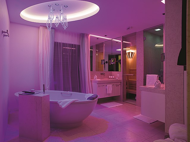 Avec ses nouvelles suites spa, la station 5 étoiles a créé une oasis qui s’adresse à tous les sens, l’esprit et le corps. Des tissus doux, des couleurs harmonieuses, des cristaux étincelants et surtout, la lumière – tantôt brillante, tantôt douce, parfois aux couleurs éclatantes – créent une aura de confort inoubliable, un lieu où l’on se sent bien. Pour ce faire, les concepteurs ont opté pour le système convivial de gestion de l’éclairage ZBOX installé dans les suites spa. Pour les salles de bains, Zumtobel a fourni des downlights LED et des lignes lumineuses qui offrent des effets de couleurs scintillants et un jeu de lumière dynamique.