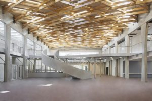 La forme architecturale et sa lumière naissent à la convergence de multiples intentions et nécessités. La structure, le climat, la lumière et le caractère public du lieu sont des notions essentielles qui ont guidé notre démarche. Pour la médiathèque de Stains, la voûte en bois qui abrite les lecteurs donne la grande échelle du lieu, sa dimension publique. Nous ne voulions pas climatiser, donc nous avons d’emblée renoncé à une voûte entièrement vitrée notamment pour éviter les échauffements solaires trop importants. Notre choix s’est orienté vers une couverture ponctuée de trous qui pouvaient « fabriquer » une lumière naturelle plus intérieure. La structure en lames de bois croisées est dessinée pour diffracter la lumière en de multiples reflets et faire disparaitre la source elle-même de la lumière. Ensuite, nous avons trouvé une solution d’éclairage artificiel qui ne laisse pas voir les sources lumineuses afin de renforcer cet effet et faire en sorte que le plafond entier soit lumière. C’est cette lumière qui donne l’identité du lieu. Tout le travail du projet consiste à faire converger ces idées dans une forme qui les rassemble en un seul trait. D’ailleurs, à Stains, cette façon de tresser le toit vient fondamentalement de la lumière qui se trouve à l’origine de la structure. Ainsi, la disposition en quinconce de petites barrettes lumineuses vient révéler la profondeur de cette nappe et joue de ces multiples facettes de bois par ces éclats de lumière qui se renvoient les uns aux autres et forment cette qualité de lumière particulière. C’est bien sûr l’aboutissement d’un travail d’équipe avec les ingénieurs de la structure et les concepteurs lumière, chacun apportant sa propre vision du lieu pour composer avec nous la lumière.