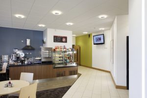 Afin de varier les ambiances et les options d’éclairage, Kometa 300 LED propose la fonction innovante de double allumage. L’utilisateur a ainsi la possibilité d’allumer indépendamment l’un des deux éléments, diffuseur ou réflecteur, ce qui lui garantit une flexibilité totale d’utilisation. Il peut désormais éclairer uniquement la surface souhaitée, sans perte d’énergie. Dans un hôpital par exemple, le double allumage serait utilisé le jour et l’ambiance seulement la nuit pour un éclairage de sécurité économisant la moitié de la puissance. Kometa 300 LED se décline aussi en version dimmable. Associé au variateur DALI de Sylvania, il offre diverses options de gradation pour une intensité de lumière réglable en fonction des besoins. Installé en saillie, il peut aussi être encastré dans les faux plafonds grâce aux accessoires proposés par Sylvania (dalle d’encastrement de 600 x 600 et cadre pour plaques de plâtre) pour un rendu doux et esthétique. Alliant un design circulaire inédit et des performances élevées, Kometa 300 LED présente un autre atout non négligeable pour les gestionnaires des établissements tertiaires sur les espaces de circulations ou de couloirs : une réduction des coûts de rénovation grâce à un niveau d’éclairement tout aussi efficace que des downlights, et ce, avec 30% d’appareils en moins.