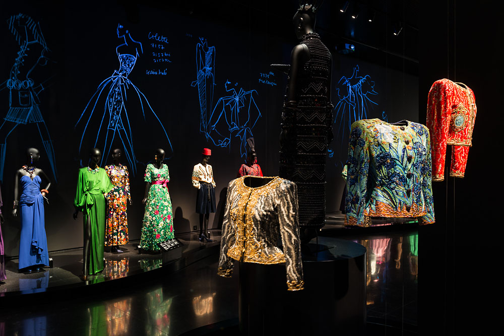 La salle d’exposition permanente du musée est l’œuvre de l’architecte et scénographe français Christophe Martin, qui a délibérément choisi de ne pas mettre en scène une rétrospective classique dans le nouveau musée de Marrakech. Pour des raisons de conservation, les œuvres présentées sont remplacées à intervalles réguliers par d’autres modèles haute couture de la collection de la Fondation Pierre Bergé, qui compte au total plus de 3 000 pièces. Cette mesure a permis de ne pas les exposer trop longtemps. C’est pour cette même raison que la technique LED a été choisie pour l’éclairage. Akari-Lisa Ishii, conceptrice lumière, a conçu l’éclairage architectural du musée : de la cour d’entrée dotée d’un monolithe sur lequel se détachent les lettres YSL, jusqu’à la boutique du musée, en passant par l’auditorium. Akari-Lisa Ishii explique : « Les LED n’émettent presque pas de rayonnement thermique et UV, ce qui constitue un atout majeur lors de la mise en lumière des textiles sensibles et très précieux. »