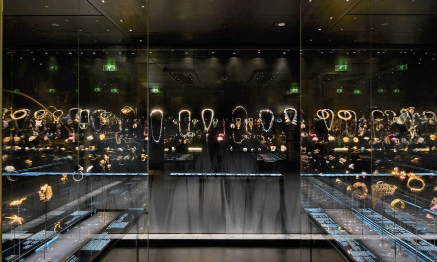 Les appareils iGuzzini ont été choisis après une série de tests. La configuration apportée à l’aménagement dès la première intervention de Roberto Ostinelli n’a pas changé. Les reflets qui n’ont pas pu être éliminés ont été exploités pour créer une illusion d’optique : les bijoux sont agencés dans les vitrines selon la position qu’ils occuperaient sur un corps humain, et avec le reflet, le visiteur voit le bijou sur lui-même. La température couleur choisie de 4 000 K met l’or en valeur et fait resplendir les pierres précieuses, ainsi que les émaux.