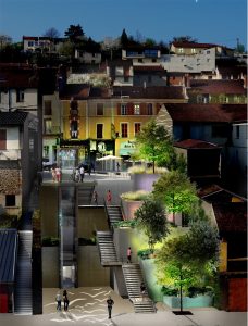 « Le nouvel aménagement redonne la place aux piétons, aux cyclistes, et réintroduit de la nature là où elle avait disparu, répondant ainsi aux attentes des habitants, précise l’architecte. Le caractère très original du passage nous a conduits à imaginer un lieu de pause où les gens auraient plaisir à s’attarder. Ainsi, nous avons ponctué les paliers des escaliers de terrasses végétalisées. »