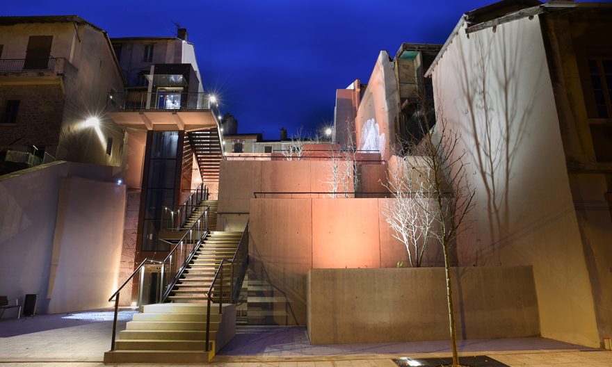 Une fois n’est pas coutume : ici, la lumière naturelle occupe un rôle prépondérant dans l’aménagement du paysage et la perception de la percée pendant la journée. Le défi était de taille : il fallait que l’image nocturne des espaces fasse écho à l’œuvre des architectes et à ce que les habitants voient de jour. Le concepteur lumière s’était déjà familiarisé avec Decazeville quelques années auparavant lors de la mise en lumière du chevalement minier. Engagé dans l’étude éclairage dès le concours, Lionel Bessières a travaillé sur les volumes de la percée : « Cette brèche dans le tissu urbain s’ouvre sur une vue magnifique de la vallée, en bas de la déclivité ; nous étions en quelque sorte liés par cette perspective. Et même si, la nuit, les arbres disparaissent dans l’ombre, il fallait restituer cette respiration dans le bâti et comprendre les volumes imaginés par les architectes. Pour cette raison, nous sommes allés assez loin dès le début du concours en termes de rendus graphiques, d’images 3D et avons effectué un gros travail de modélisation afin d’anticiper le plus possible les effets lumière et de vérifier les niveaux d’éclairement dans les escaliers. » Requalifiée, la rue Cayrade a elle aussi bénéficié d’un nouvel éclairage, fonctionnel et simple, qui guide le piéton vers cette percée.