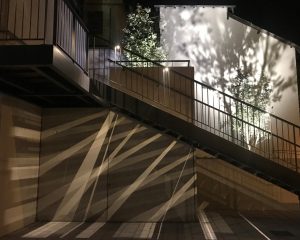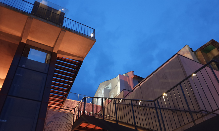 La mise en lumière évolue au cours de la soirée, avec des tons blancs durant la semaine et des lumières colorées le week-end ou lors d’événements particuliers. Des encastrés de sol, pilotés en DMX, éclairent les verticales et la fresque de Sébastien Mazauric, qui a pu jouer avec la lumière artificielle afin de générer des ombres sur son œuvre. « Aujourd’hui, ajoute Lionel Bessières, je n’utiliserais cependant pas cette typologie de luminaires qui illuminent les arbres, nous devons réapprendre à mieux respecter le ciel nocturne ! Les escaliers, quant à eux, sont éclairés à l’aide d’appareils miniatures, insérés dans les mains courantes et adaptés sur place lors des réglages. La lumière résiduelle se faufile entre les marches et vient, comme par magie, créer des effets inattendus sur le sol. Devant l’ascenseur, des images de gobos projetées au sol reprennent le même graphique que la fresque imprimée sur les parois béton et sur les façades aveugles environnantes. C’est grâce à la modélisation 3D que nous avons pu dimensionner la taille des projections des gobos au tout début du projet. »