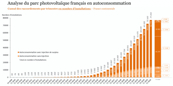 À fin août 2020, l’analyse du parc photovoltaïque en France montre que le résidentiel (< 9 kW) représente 15 % (1 389 MW) du cumul des raccordements, soit une hausse de 6,9 % sur un an, pendant que les moyennes toitures (9 – 100 kW) représentent 20 % (1 793 MW), soit +16 % sur un an. Compte tenu des engagements environnementaux de la France, le solaire photovoltaïque est promis à de beaux jours.