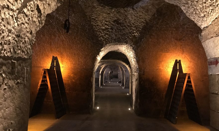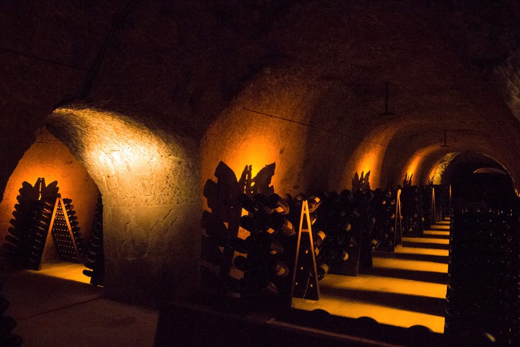 Le parcours entraîne les visiteurs jusque dans les galeries-caves où les bouteilles sont disposées sur des pupitres inclinés (chevalets en chêne) pour la deuxième fermentation qui transforme le vin tranquille en vin effervescent. Le dépôt descend lentement vers le col, suivant l’inclinaison des bouteilles jusqu’à ce qu’elles soient amenées à la verticale par le remueur. De petits spots, fixés au sol, projettent une lumière orangée (longueur d’onde de 590 nm) sur les pupitres et les voûtes, tandis que des réglettes en sous-faces des pupitres tracent des bandes régulières perpendiculairement au cheminement. Dans l’allée principale, le concepteur lumière a créé deux saillies de chaque côté pour encastrer des appareils au sol, ponctuant, comme des bougies, la déambulation de lumières plus blanches.