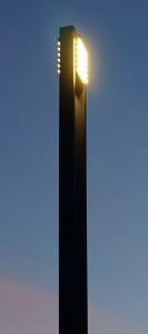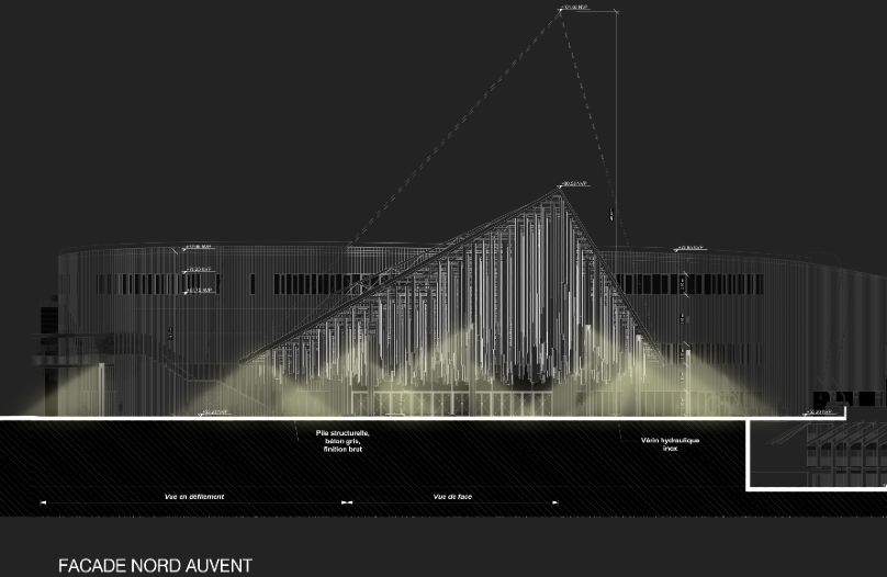 Pour le parvis du pavillon 6, l’équipe de Seulsoleil a par ailleurs imaginé un dispositif d’éclairage sur mât à double feu (développé avec Ewo). « Composé de 6 trains d’optiques étagées éclairant plus ou moins loin, poursuit François Gaunand, le système permet d’envoyer la lumière exactement où l’on veut, car il fallait absolument éviter de venir taper avec la lumière sur les pendrillons. Cette solution répond aux deux situations de l’auvent : positions à 25° et à 45°. Lorsque l’auvent est à 45°, les pendrillons se lèvent et l’éclairage en sous-face recule : le double système optique vient donc éclairer le parvis à ce moment-là. Les luminaires des 5 mâts sont asservis au pilotage de l’auvent : les optiques les plus hautes éclairent plus loin, les plus basses, plus près. »