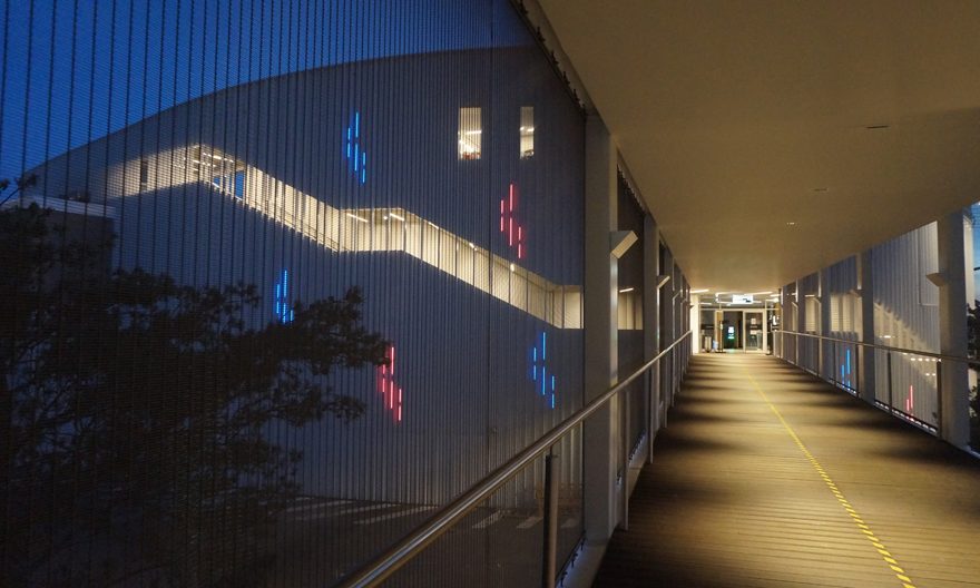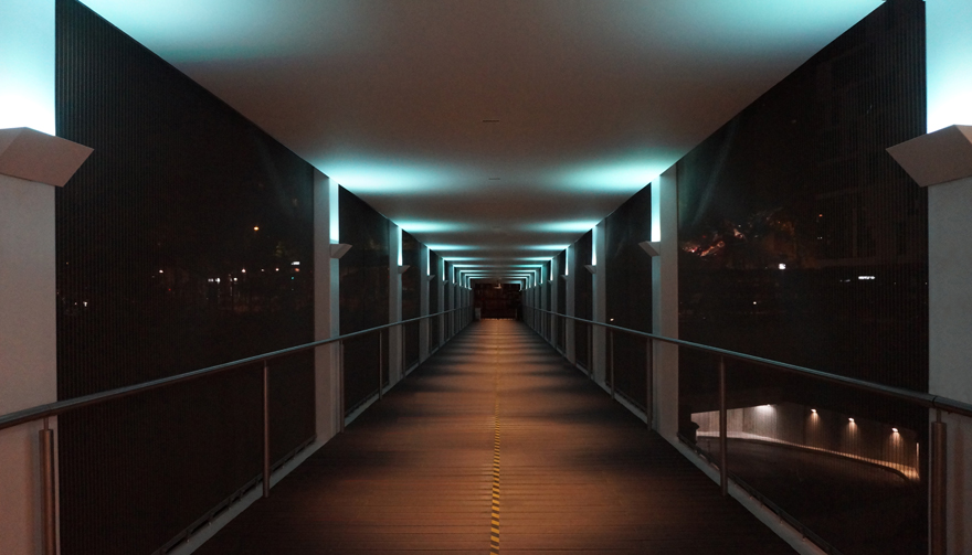 Toujours dans cette logique d’accompagner la fonction ou l’architecture, Seulsoleil a défini une mise en lumière dynamique pour la passerelle qui part du niveau 1 du pavillon 6 et conduit au parking de l’avenue de la Porte-de-la-Plaine. L’éclairage accompagne la traversée piétonne, un peu comme si la lumière se modifiait au fur et à mesure que l’on avance sur la passerelle. Au plafond, des encastrés, à peine perceptibles, fournissent l’éclairage au sol, tandis que des appliques à émission indirecte ont été conçues spécifiquement pour s’adapter aux poteaux de la passerelle.