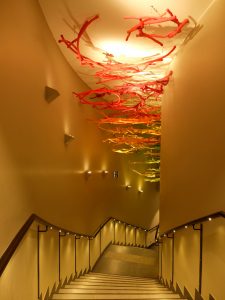 Mais c’est avec un plasticien, Jean-Jacques Pigeon, que s’ouvre le deuxième volet de cette aventure lumière. L’artiste a en effet imaginé une œuvre, « Volutes Végétales », dans le Hub des Services, situé à l’entrée du parc des expositions. Ce point d’informations comprend une réception, un espace bébé et enfants, un Relay et un Daily Monop’, deux blocs sanitaires avec deux escaliers où l’œuvre a été installée. Celle-ci prend la forme d’un arc-en-ciel suspendu constitué de branches ou brindilles, plâtre, pigment, d’émulsion acrylique. Dans un escalier, Jean-Jacques Pigeon a fait appel à des couleurs chaudes et dans l’autre, des couleurs froides. François Gaunand a accompagné les œuvres avec la même déclinaison de teintes de lumière. Elles sont éclairées par des petits projecteurs orientables en contre-plongée montés en appliques et habillés d’un carter. L’éclairage fonctionnel de l’escalier est réalisé par des encastrés miniatures dans la main courante.