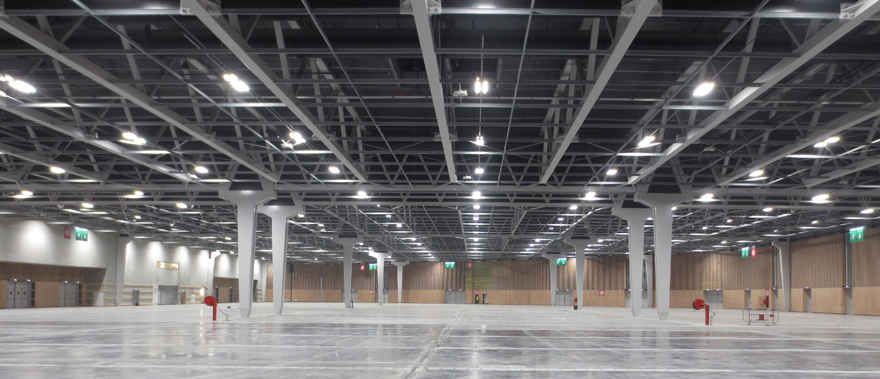 Derrière la façade, les 15 000 m² de la surface d’exposition ont été éclairés par les luminaires, utilisés dans les autres pavillons, positionnés selon une trame de 9 m x 9 m. Cet éclairage fonctionne principalement au moment du montage et du démontage des stands d’exposition. Pendant les salons, il peut être modulé pour laisser la place aux dispositifs mis en œuvre par les exposants eux-mêmes. Les services techniques ont la capacité, à la demande des exposants, d’éteindre à l’aplomb de leur stand par simple télécommande. Ainsi, chaque luminaire est contrôlable pour l’allumage, l’extinction ou la gradation.