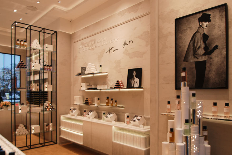 Le corner de 60 m² du Bon Marché, à Paris, comprend les trois univers de la Maison Parfums Dior. La lumière accompagne harmonieusement l’aménagement des différents espaces. « Le défi à relever ici, remarque Akari-Lisa Ishii, consistait à mettre en œuvre le concept lumineux pour chacun d’eux tout en prenant en compte l’architecture du magasin, même si le corner Dior était doté de son propre plafond. » Cela a permis d’y encastrer les spots pour l’éclairage général tandis que les rubans led étaient intégrés dans les parois verticales, conformément au concept lumineux. Là aussi, les niveaux d’éclairement élevés associés à des températures de couleur relativement chaudes enveloppent les clients d’une lumière douce et apaisante, en particulier dans l’espace soins qu’il fallait rendre le plus « cocooning » possible.