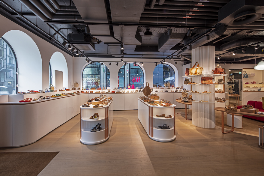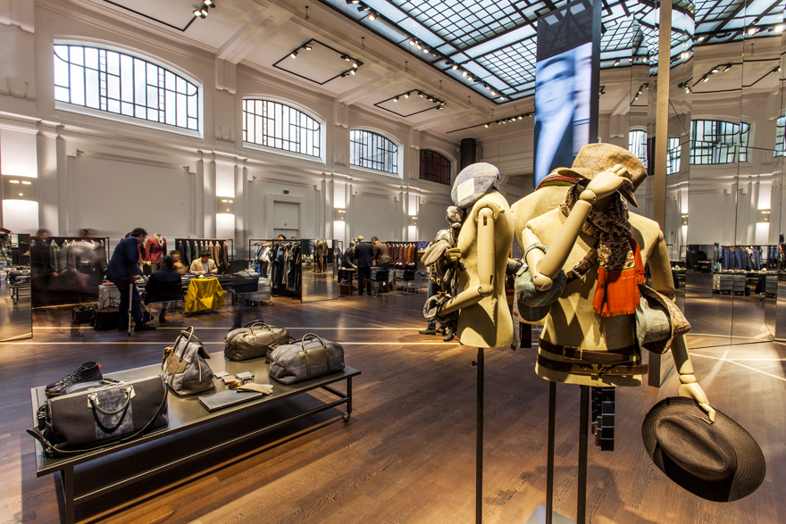Malgré les huit mètres de haut de la vaste halle principale du bâtiment Art nouveau, la lumière led brillante oriente consciencieusement le regard des clients sur les costumes, chemises et accessoires. Un subtil rendu des couleurs, des contrastes et des accents prononcés font ressortir matières et détails.