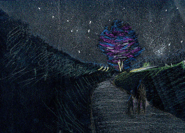 Ensuite, j’ai réalisé un parcours nocturne « Au clair de vigne » qui conduisait d’un village jusqu’à une table d’orientation en pleine campagne. Je souhaitais aider les habitants à entrer doucement dans la nuit tout en les guidant dans l’obscurité pour qu’ils contemplent le paysage nocturne.