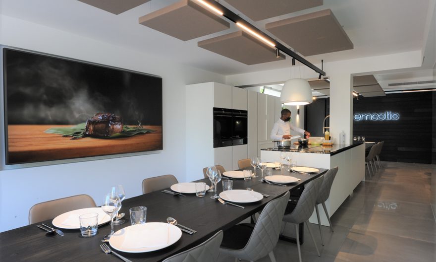 Afin de gérer le mieux possible l’ambiance sonore de la pièce, l’architecte a choisi d’installer des caissons acoustiques, ce qui atténue le bruit des couverts mais, en revanche, prive aussi la pièce de faux plafond. Dans ce contexte, il était impossible à Pascal Loiré d’encastrer des luminaires : il a donc utilisé les panneaux acoustiques suspendus pour venir y insérer des structures de profils 48 V dans lesquels il a intégré soit des systèmes d’éclairage linéaires pour l’éclairage général, soit des projecteurs pour l’éclairage d’accentuation. Il a par ailleurs placé, au-dessus de l’îlot de cuisson, une hotte aspirante en forme de cloche qui est également éclairante. « J’ai traité ce projet en étroite concertation avec José Piquer, un architecte avec qui je travaille régulièrement. J’avais notamment éclairé un centre pédagogique conçu par lui, il y a quelques années. Ce qui m’intéresse dans son approche, c’est qu’il a pleinement conscience du rôle de l’éclairage et dans quelle mesure il peut être un support à la pédagogie. Pour Emootio, je suis parti d’une feuille blanche avec pour seule contrainte la configuration tout en longueur de la pièce », confie Pascal Loiré.