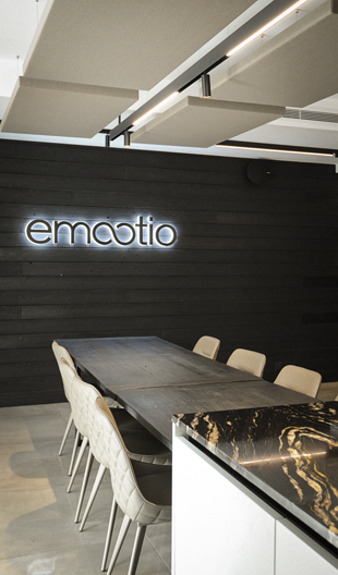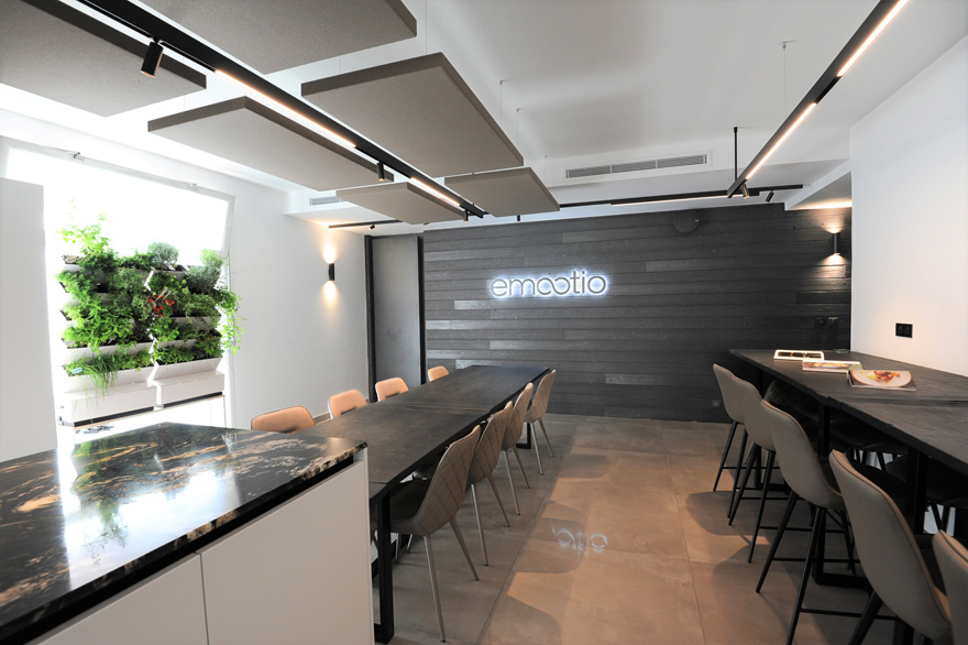 La mise en œuvre d’une solution Casambi offre la possibilité de piloter l’ensemble de l’éclairage uniquement avec le câble existant. La programmation permet de contrôler toute l’intelligence de l’éclairage qui se trouve au niveau des luminaires et de gérer les différentes scènes lumineuses. L’ambiance « accueil » associe éclairage général et éclairage d’accentuation. Ensuite, la zone « préparation culinaire » met en œuvre un niveau d’éclairage général élevé. « C’est volontairement que nous n’avons pas disposé d’appareils spécifiques à cet endroit car nous souhaitions conserver l’harmonie esthétique de la salle », précise Pascal Loiré. L’aspect esthétique du lieu jouait en effet un rôle très important dans le parti pris de l’éclairage : le revêtement du sol et le mobilier aux teintes chaudes, les chaises haut de gamme, les tables en bois du Brésil, le mur, avec le logo Emootio, en bois brûlé que l’on utilise au Japon. Dans cet esprit, Pascal Loiré a choisi une température de couleur de 3 000 K, qui est un bon compromis : 2 700 K était trop chaud et 4 000 K trop blanc.