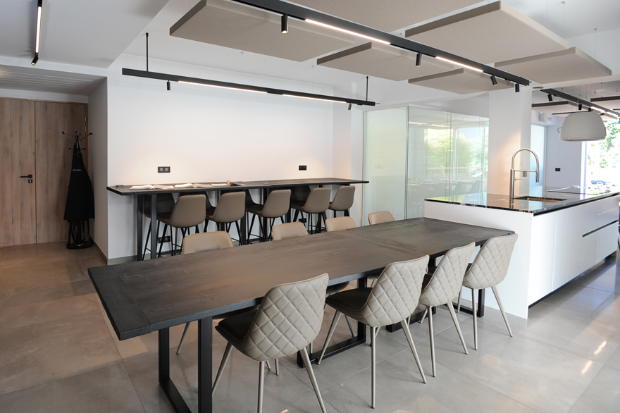 Le principe de la grande salle à manger est d’offrir un espace convivial aux stagiaires le midi plutôt que de ne leur laisser d’autre choix qu’un plateau-repas ou de déjeuner au restaurant, qui risque d’être éloigné et peut-être bruyant. « L’idée était de créer un espace attenant à la salle de formation que nous avons aussi éclairée et de proposer aux stagiaires un moment convivial et gastronomique en présence d’un chef qui prépare les plats devant les convives », explique Pascal Loiré, gérant de la société Intension à qui a été confiée l’étude d’éclairage. Ainsi, José Piquer, architecte, et Christophe Linconnu, directeur artistique, agence Super Sans Plomb, ont créé cette grande pièce qui s’articule autour d’un îlot central, ce dernier étant la partie technique du chef, avec tous les éléments professionnels nécessaires à la préparation des plats et leur cuisson. De part et d’autre de cet îlot sont disposées deux longues tables autour desquelles les participants s’installent pour déjeuner.
