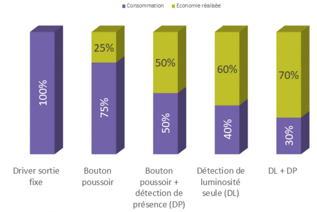Illustration des économies réalisées grâce à la détection de présence et de luminosité.