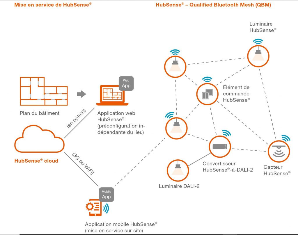 Autre spécialiste de systèmes de gestion, Osram Digital Systems propose plusieurs solutions dont la gamme HubSense. Il s’agit d’un ensemble d’outils logiciels qui permet aux agents de mise en service, aux entrepreneurs, aux installateurs et aux gestionnaires d’installations de configurer, contrôler et gérer les infrastructures d’éclairage commerciales avec les composants « Works with Osram HubSense » basés sur un maillage Bluetooth qualifié (QBM : qualified Bluetooth mesh). « La communication s’effectue sans fil, explique Thierry Bechtel, ingénieur Applications, Osram DS, ce qui implique donc un gain énorme en termes de câblage. De plus, grâce au maillage, il n’y a aucune perte de signal. On peut interconnecter les capteurs, et aussi laisser la main à l’utilisateur avec des bouton-poussoir, disposer des drivers équipés de la puce HubSense. »
