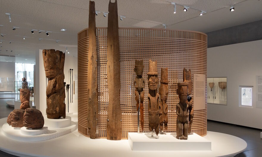 Nombreuses sont les sculptures comprenant une dimension sacrée, notamment parmi les statues qui ont été prêtées par les musées européens et qui revenaient sur leur terre d’origine. « C’est une notion très importante, remarque Alexis Coussement, à tel point que le musée a organisé une cérémonie religieuse lorsque ces objets ont été sortis de leurs caisses, comme pour la magnifique sculpture sur bois du dieu A’A ».