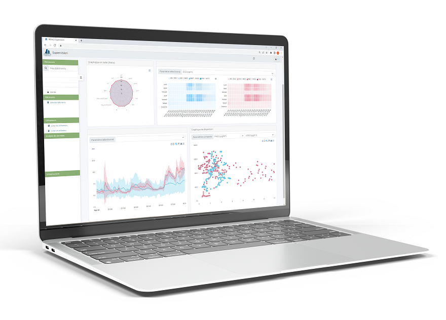 Via une passerelle vers la GTB en place, il a été possible de récupérer et remonter les températures des départs et retours des circuits de distribution, la température d’air des différents compartiments de la CTA, les débits/vitesses de la CTA. Les données sont ainsi remontées vers la supervision de la QAI, « INDALO Supervision » qui permet d’anticiper et éviter la pollution de l’air intérieur, mais aussi de réduire la sur-ventilation ou tout simplement ventiler au plus juste selon le nombre d’occupants, le nombre d’occupants heure par heure étant estimé en fonction notamment des paramètres de Température, hygrométrie, et CO2.