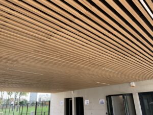 « Lorsqu’on arrive près des bâtiments, on passe sous un auvent doté d’un plafond en bois, précise Pierre-Emmanuel Kiehl. Afin de conserver la géométrie et la teinte chaude de cet élément architectural, nous avons inséré des bandes de rubans leds entre les lamelles de bois. L’effet est saisissant : la lumière semble émaner du bois lui-même ! » Clareo Lighting a fourni 1 500 points lumineux pour l’ensemble des espaces techniques, bureaux et circulations des deux bâtiments.