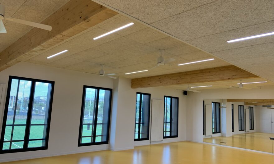 Le deuxième bâtiment sera dédié au football et au rugby. « Nous sommes intervenus à la demande de l’installateur, commente Pierre-Emmanuel Kiehl, technico-commercial, Clareo Lighting, qui recherchait des solutions pour répondre à l’étude d’éclairage déjà réalisée. Nous avons proposé nos luminaires Tubuleds basse luminance dont la lentille, légèrement en retrait, limite l’éblouissement. » Les Tubuleds offrent une efficacité de 130 lm/W, avec un indice de protection IP69 et une résistance aux chocs IK10. Ils ont été installés en appliques dans les escaliers, en saillie dans les circulations et les vestiaires. L’éclairage de ces derniers a été complété par des downlights encastrés. Tous les luminaires fournis ont une température de couleur de 4 000 K. Au premier et deuxième étages, l’éclairage des bureaux et des espaces destinés à une activité sportive, comme les salles de musculation, a été réalisé à l’aide de lignes lumineuses en DALI, fabriquées sur mesure car un IRC supérieur à 90 était demandé.