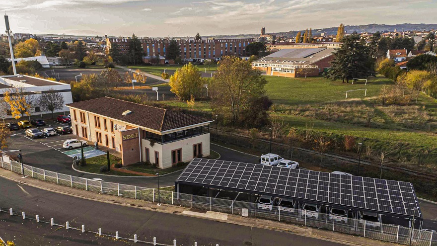 Sirea donne l’exemple de sa réalisation pour le site du SDET (Syndicat d’énergie du Tarn) à Albi. L’installation comporte 30 kWc d’ombrières, 8 points de charge sur le parking et une armoire de stockage AEH 30 de Sirea. Cette armoire contient un onduleur hybride de 20 kW (conversion PV et charge/décharge de la batterie) et 60 kWh de batteries recyclées. Cette installation est contrôlée par un EMS de Sirea assurant la fonction de stockage du surplus dans les batteries et la décharge au lieu du soutirage réseau, ainsi que la fonction de limitation de la puissance des bornes pour éviter un dépassement de la puissance souscrite, sauf si la puissance batterie ou PV est disponible. Le monitoring se fait par l’application MicroSERVER de Sirea.