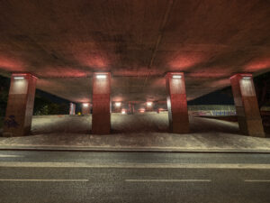 Les linéaires sont placés en haut des piles et piliers, créant un éclairage patrimonial pastel doux sur le « plafond » du passage, surnommé la « cathédrale » au niveau de l’arrêt de bus de la ligne 38.