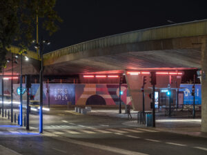 L’équipe de Concepto a donc abordé le projet par le prisme confortable de la lumière. Cependant, dans un tel nœud de circulation, l’aspect fonctionnel de l’éclairage tenait une place importante. Souhaitant conserver une certaine harmonie avec la mise en lumière de l’esplanade Alice-Milliat réalisée par 8’18’’ (tandis que l’Arena a été mise en lumière par Philippe Almon), Concepto a repris la même modénature de mâts mais pas les mêmes projecteurs. Ces derniers sont disposés à des hauteurs différentes de manière à fournir de la lumière partout où cela est nécessaire et a même intégré, en pied de mât, des lignes verticales bleues dédiées à l’éclairage des circulations piétons et pistes cyclables. Cet éclairage fonctionnel du nouvel aménagement, destiné à apaiser et simplifier la lecture de l’espace par le piéton, est complété par une mise en lumière « expérientielle » colorée des tabliers sous les ouvrages d’art.