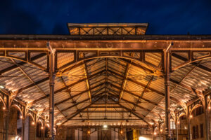 Le concept lumière est porté par la volonté d’offrir un projet souple et parfaitement intégré à la halle. « Aucun encastré de sol n’a été utilisé pour la mise en lumière de la halle, précise Lionel Bessières, seulement des éclairages latéraux et en plongée issus de projecteurs de petites dimensions que nous avons fixés discrètement sur la structure de la halle. »