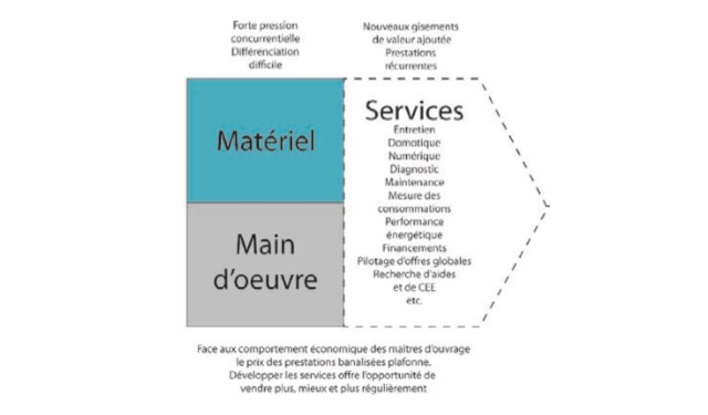 Mauvaise nouvelle, la conjoncture n’est pas favorable à l’établissement de prix de vente réalistes. Le comportement des acheteurs, la pression concurrentielle, l’arrivée d’entreprises étrangères, l’apparition des courtiers en travaux ou autres services en ligne entrainent inexorablement les entreprises vers le moins-disant. Les marges de manœuvre sur les composantes main d’oeuvre et matériel étant de plus en plus limitées, la seule manière qu’a l’entreprise de faire varier son prix et de jouer sur la dimension de service. Un lien plus fort avec le client, des prestations récurrentes, un périmètre d’intervention élargi, une réponse en terme d’usage plutôt que de technique, tous ces aspects peuvent concourir à se différencier durablement et à convaincre le client de mettre au second plan le paramètre prix, au profit du confort, de la flexibilité, des économies d’énergie et de la sécurité.