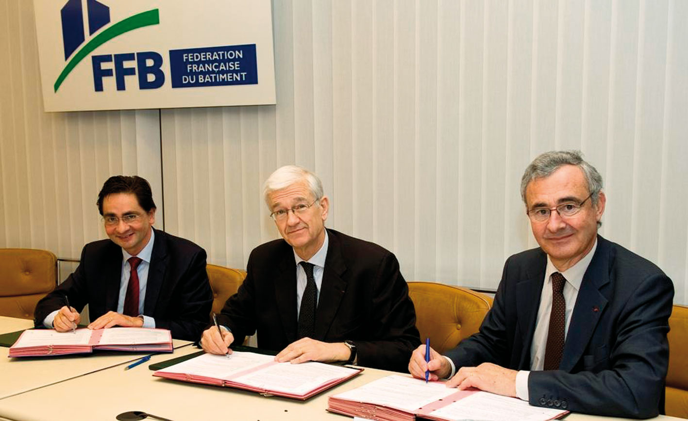 Le 20 février dernier, Didier Ridoret et Patrice Richard, président du directoire du groupe Point.P, ont signé une convention de partenariat, placée sous le par- rainage du Plan Bâtiment durable représenté par son président, Philippe Pelletier. Celle-ci vise à mobiliser les entrepreneurs et artisans du bâtiment afin de les inciter à se former via Feebat pour accéder aux qualifications RGE (Reconnu garant de l’environnement) et notamment à celle des « Pros de la performance énergétique », dans le contexte de l’éco-conditionnalité au 1er juillet 2014 :
