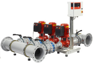 Système Plug and Play, préassemblé, prétesté et composé de 3 ou 4 pompes électroniques en ligne de type LRE (1,5 kW à 4 kW) ou SIE (5,5 kW à 22 kW). Coffret de commande pour piloter et optimiser le fonctionnement et la vitesse de rotation des pompes.