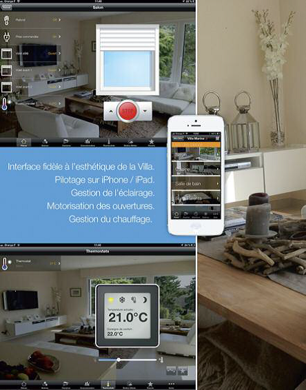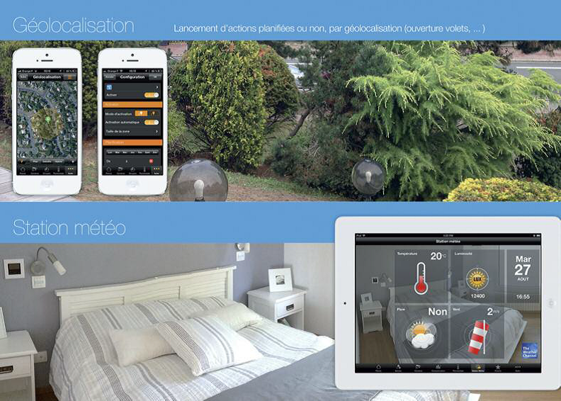 Programmation de scénarios interfonctionnels : Mode absence : extinction de tous les éclairages, extinction du système audio/vidéo, mise sous surveillance de la maison, alerte via mail. Optimisation énergétique : ouverture des volets, y compris en cas d’absence, en fonction de l’ensoleillement. Sécurité : allumage des éclairages extérieurs en cas de détection de présence à l’extérieur avec envoi de l’information. Scénario « arrivée », qui prépare la maison avant l’arrivée des propriétaires : allumage du chauffage, cumulus, ouverture des volets, eau. Tous les scénarios peuvent être déclenchés par géolocalisation en fonction de zones « entrantes ou sortantes » et/ou planifiés. De nouveaux scénarios peuvent être créés directement depuis un smartphone ou une tablette depuis la solution de supervision. La supervision MyLifedomus a été retenue pour son intégration rapide (intégré au projet ETS), sa facilité d’utilisation et son coût très abordable (850 € tout compris). Belle interface intuitive et personnalisable via smartphone ou tablette sans repasser par ETS (très pratique et véritable gain de temps).
