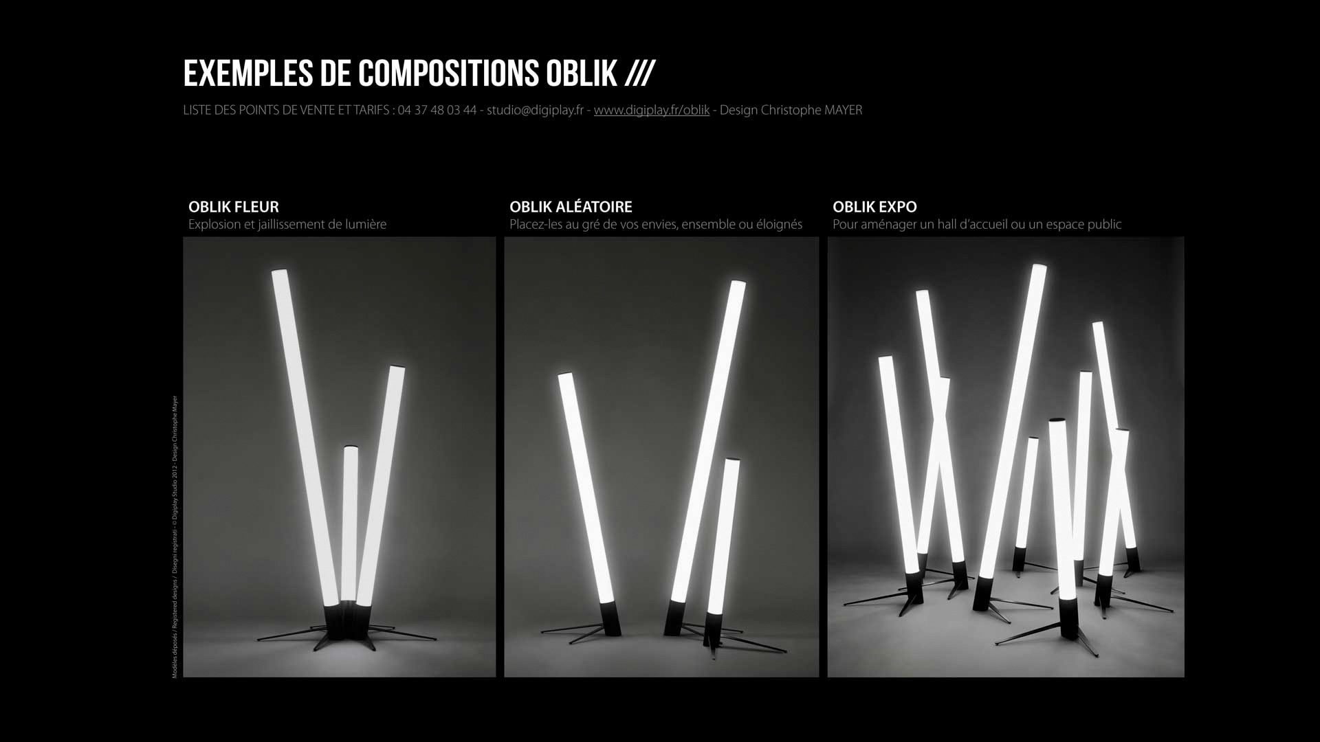 Oblik est un luminaire contemporain composé de tubes de lumière réglables en intensité, grâce à leur commande tactile.Ils contiennent des centaines de LED, éclairent sur toute la hauteur et sur 360° d’une lumière blanche, douce ou intense, selon l’ambiance recherchée. Il s’adapte aisément à l’environnement de par ses formes légères et son style épuré. Objet lumineux et architecturé, on l’imagine aussi facilement prendre place dans un hôtel, un restaurant ou un hall d’accueil et venir créer l’animation lumineuse d’un événement. Chaque luminaire est vendu individuellement et se branche sur une prise secteur 220 V.
