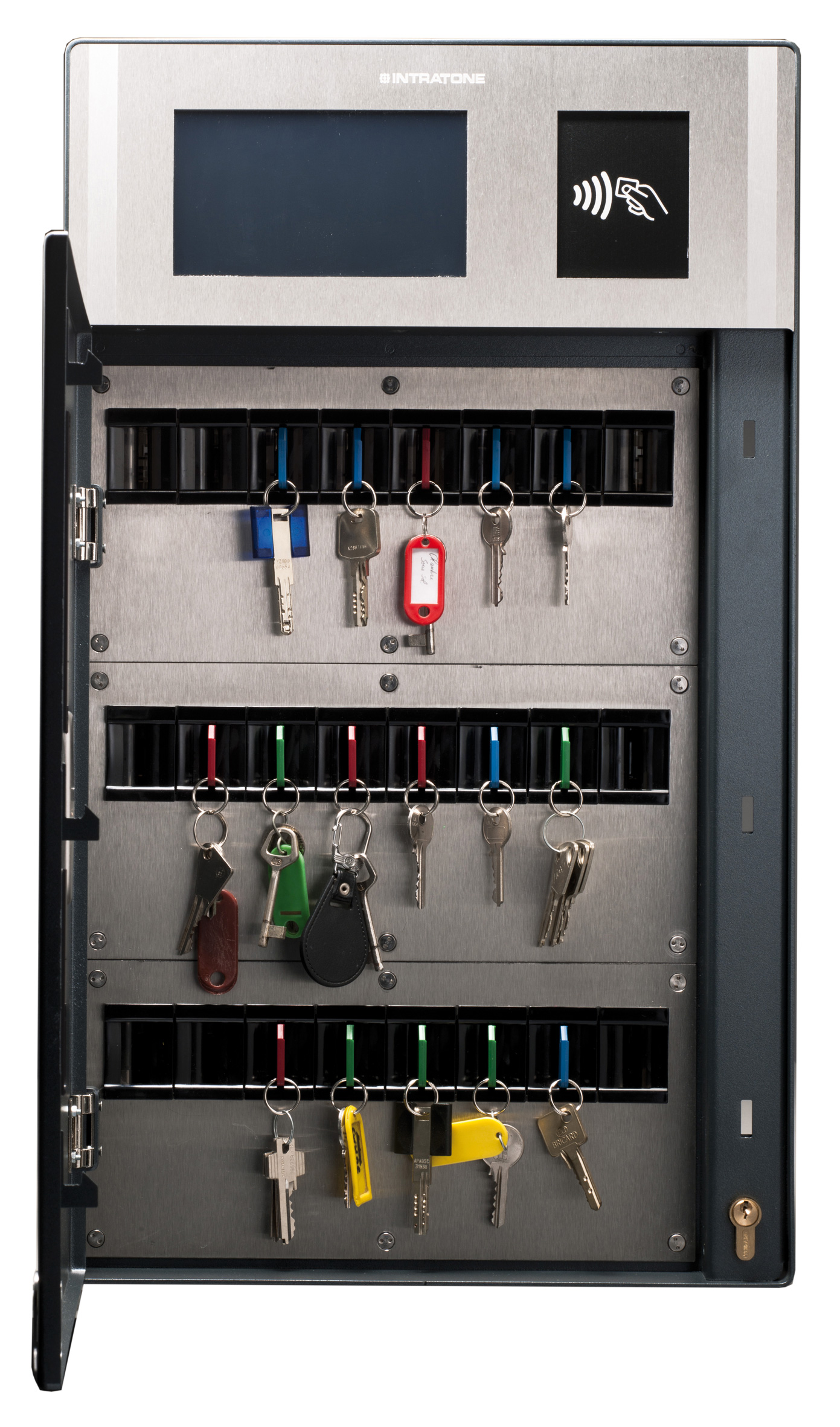 La dernière innovation INTRATONE est une armoire à clés, totalement informatisée et gérée via une interface web qui permet de géo-localiser et de retrouver ses clés en temps réel, le tout sans avoir besoin de câbles ou de fils. L’identification des trousseaux de clés se réalise grâce à l’intégration d’une puce Mifare dans chaque porte clé étiqueté. De ce fait, les clés sont toujours géo localisées et leurs entrées et sorties sont archivées. C’est grâce à une interface web que l’utilisateur pourra retrouver son trousseau. La formule prépayée en illimitée offre la possibilité de ne pas trop dépenser tout en gérant le système Intratone.