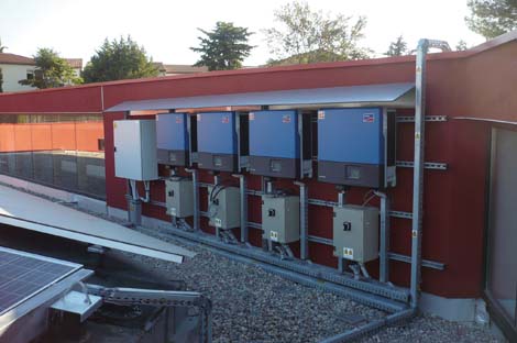 - une toiture inclinée à 11° de 132 modules de 250 W soit 33 kWc qui alimentent deux onduleurs SMA Sunny Tripower triphasés de 15 kVA et devraient produire 42,6 MWh/an ;