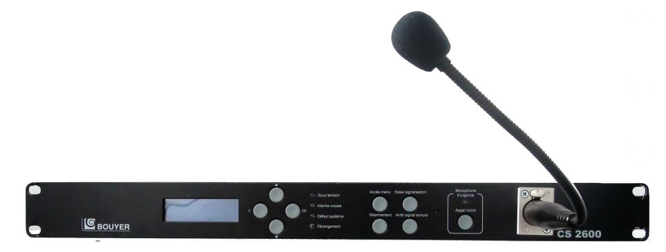 La centrale de surveillance CS2600 de Bouyer est l’élément centralisateur du système de sonorisation de sécurité. Dotée d’un afficheur LCD en face avant, elle est facilement configurable et consultable. Via un bus RS485 et un bus audio, elle peut gérer au maximum 40 éléments de surveillance. Les messages d’évacuation et de test sont intégrés directement à la centrale. Pour répondre aux requis de la norme EN54-16 et NF-SSI, CS2600 indique en temps réel l’état de fonctionnement de la sonorisation de sécurité par l’intermédiaire d’un ensemble de LED en fournissant les informations « Alarme Vocale » et « Dérangement Général ». Un journal des 100 derniers événements est également consultable directement sur cet afficheur.