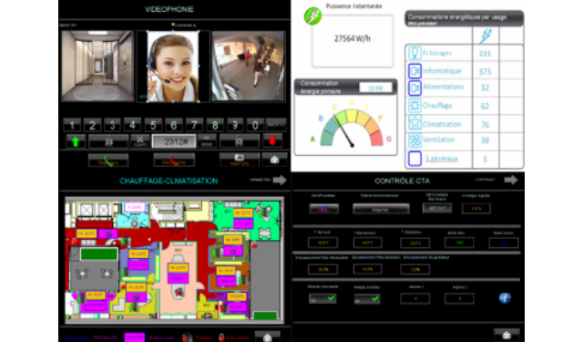 Une application disponible sur un écran tactile encastré à l’entrée de chaque lot, sur les ordinateurs des utilisateurs ainsi que sur tablette dans certains bureaux permet d’intervenir, selon les droits d’accès, à tout ou partie des fonctions de l’immeuble (dérogations, centralisations, tableaux de bord des consommations, accueil des visiteurs, caméras, passage en mode hors gel basse consommation pour les heures non travaillées, supervision des équipements…). De nombreux capteurs permettent la détection de présence sur tous les éclairages (aucun interrupteur dans les bureaux), la détection d’ouverture de fenêtre et de porte -fenêtre (sans fil-sans pile), la régulation d’air et la mesure du taux de CO2 dans certains locaux spécifiques comme les salles de réunion afin d’améliorer le confort en fonction du nombre de personnes présentes dans la pièce.