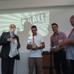 Joost Demarest, directeur marketing monde de l’association KNX, remet le prix programmation pour Pétunia, Papy et CCTP, à l’équipe blanche qui gagne un reportage vidéo pour une application faite en 2015.