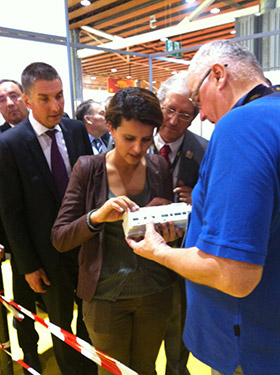 Najat Vallaud-Belkacem, ministre de l’Éducation nationale, de l’Enseignement supérieur et de la Recherche, visite le Grand Palais et s’arrête très longtemps sur le stand Legrand ; au point de s’essayer au montage électrique.