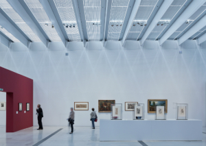 Concevoir un musée de cette envergure (Prix d’architecture de l’Équerre d’argent 2013) dans une région industrielle économiquement affaiblie était un signal fort pour la renaissance d’un ensemble minier autrefois florissant. Fondé sur un hall principal de 125 m de long et de 25 m de large, le bâtiment traduit un concept d’exposition innovant qui rompt avec les habitudes. Xavier Dectot, conservateur, historien d’art, directeur du musée, explique le parti pris de renoncer à toutes les règles de présentation classiques, par régions, époques ou techniques : « Au lieu de séparer les œuvres, nous les avons rassemblées dans la Galerie du Temps, où leur exposition suit un ordre chronologique, de l’an 3 500 av. J.-C. jusqu’en 1850 ». Rien n’est accroché au mur, les œuvres sont présentées au centre de l’espace. « De cette façon, les visiteurs peuvent s’étaler et aller partout », commente Adrien Gardère, muséographe. Dans ce concept muséographique, l’éclairage joue un rôle particulier, en combinant les lumières naturelle et artificielle qu’oriente un plafond rythmé. Afin de contrôler les larges apports et les variations de lumière du jour, le bureau d’études Arup a mis au point un système qui met en œuvre des stores empêchant les rayons du soleil d’être trop intrusifs et un éclairage artificiel LED qui permet de bénéficier d’un éclairement constant. Le recours à la lumière naturelle et à l’éclairage LED a réduit en outre les dépenses d’énergie et donné lieu à de nouvelles solutions de commande de l’éclairage, parfaitement adaptées. Ainsi, il