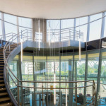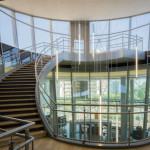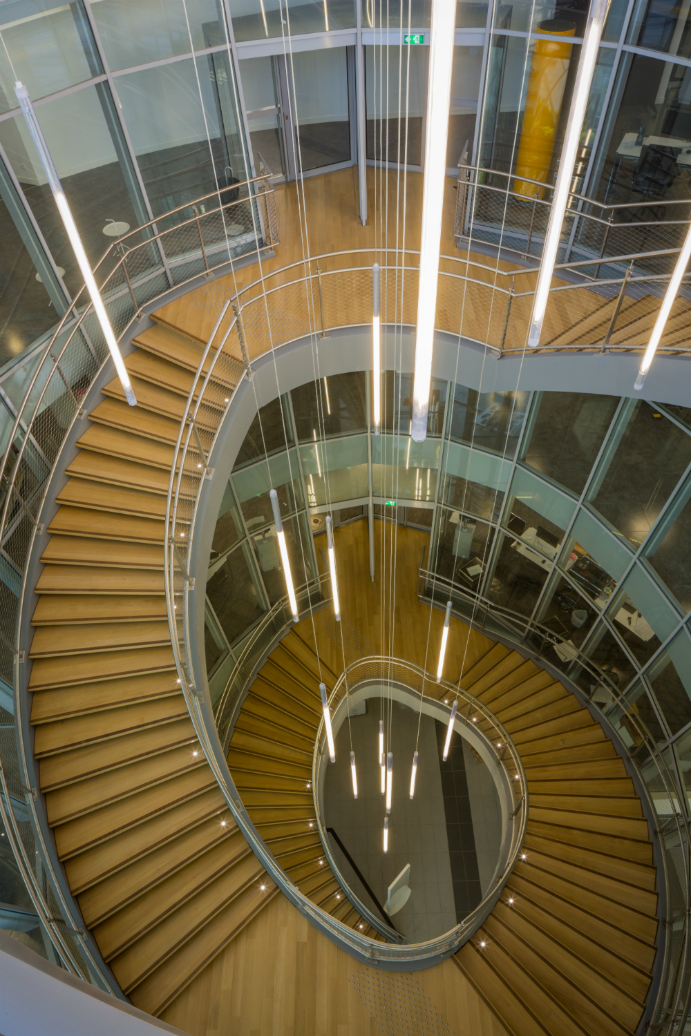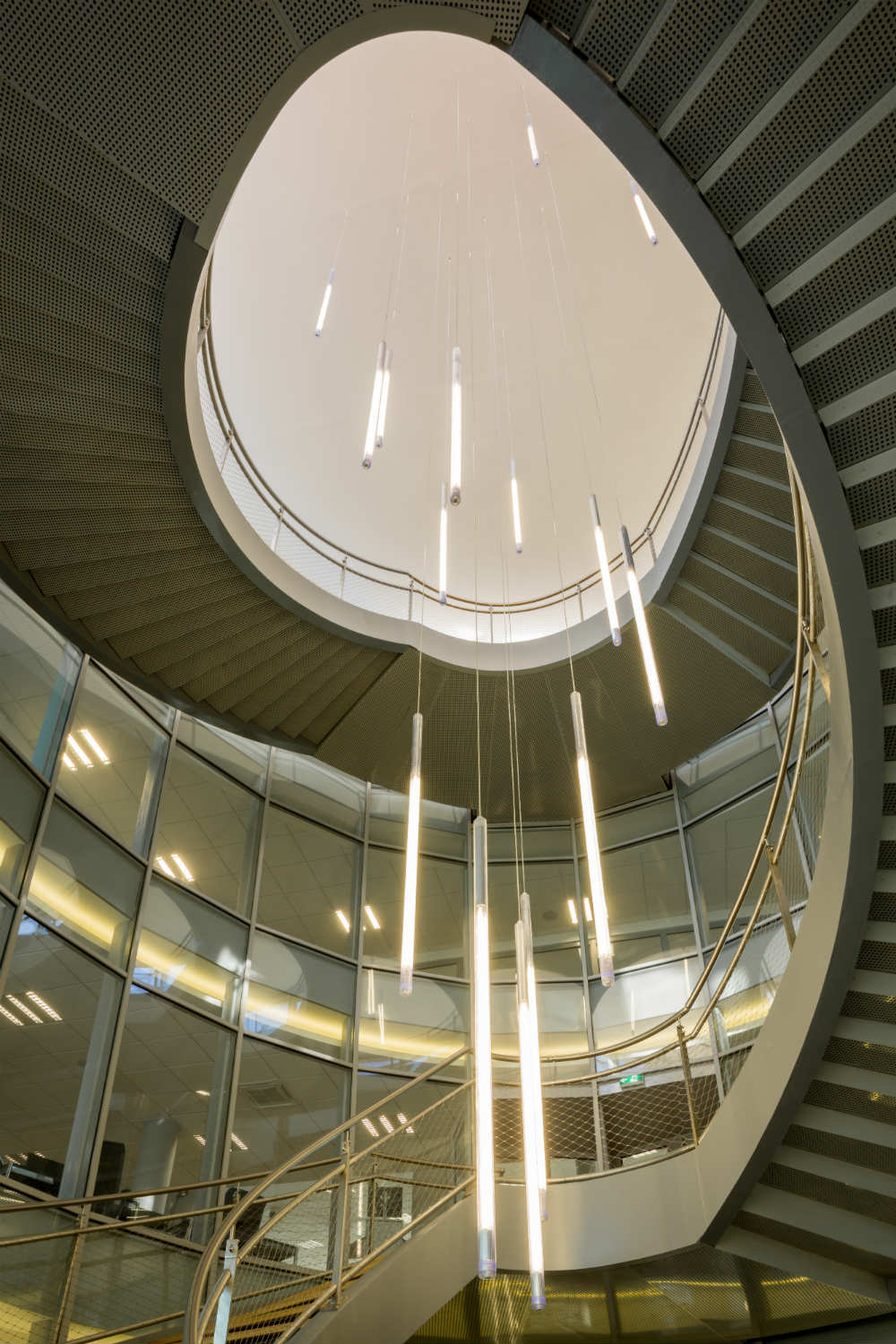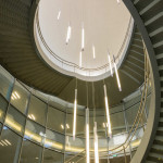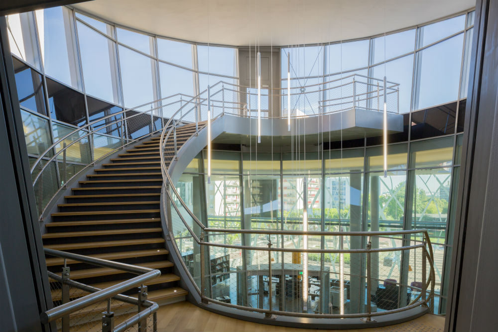 L’escalier monumental est agrémenté, quant à lui, de luminaires Tinos suspendus dotés de tubes fluorescents T5 80 W, avec une température de couleur de 4 000 K que l’on retrouve dans l’ensemble du bâtiment, pour aider à la concentration de ses visiteurs et au confort visuel de ses employés.