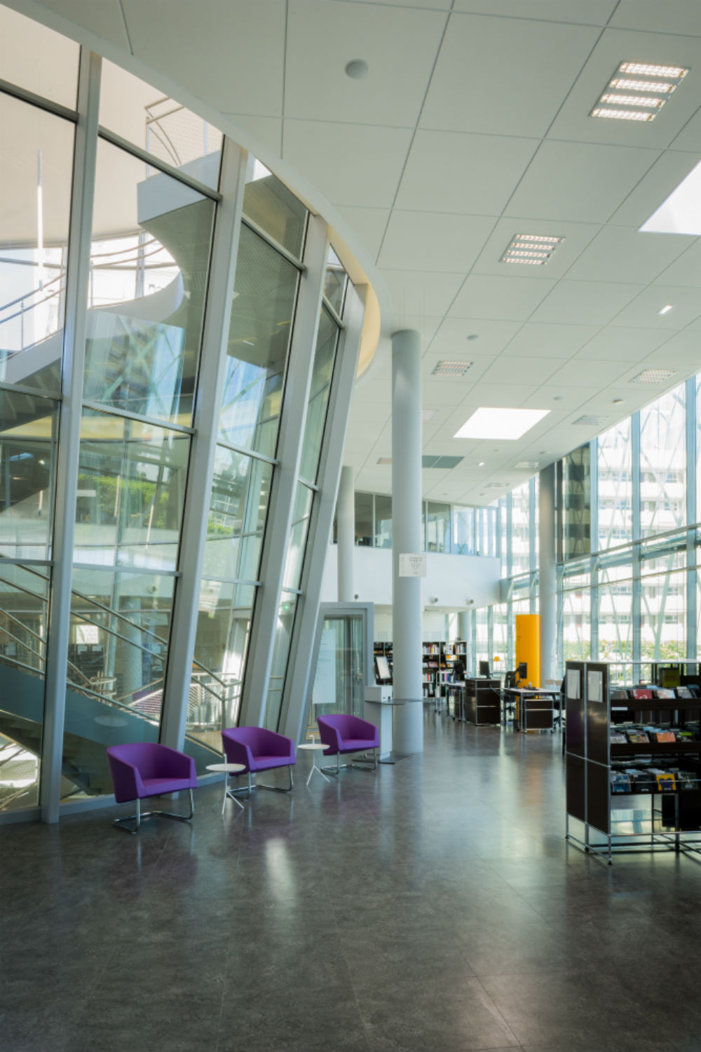 Des encastrés fluorescents Ector procurent des niveaux d’éclairement adaptés aux activités : 500 lux dans les espaces de lecture et comptoirs, 350 lux dans les bureaux et 200 lux dans les rayonnages.