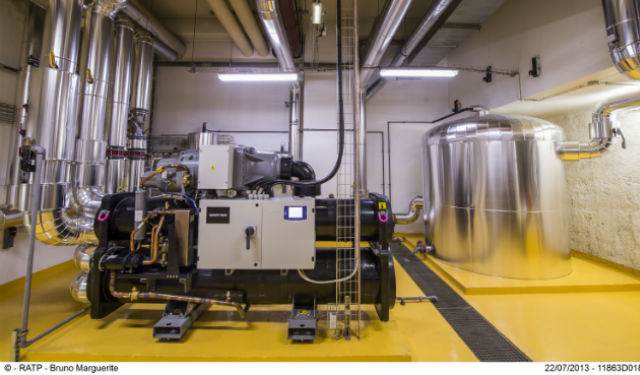 - Récupération de chaleur du groupe froid : couvre plus de 25 % du chauffage des 56 000 m2 de bureaux. Pour l’intersaison, le groupe froid suffit à couvrir l’ensemble des besoins de chauffage. Un échangeur secondaire permet également de préchauffer une partie de l’ECS nécessaire pour les douches des agents RATP.