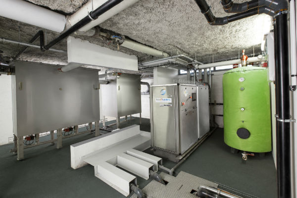 La PAC qui y est couplée va puiser les calories dans les eaux grises et fournit 100 % de l’ECS à 55 °C avec un COP de 3,9 sur ce site. Tout cela avec une seule journée de maintenance annuelle.